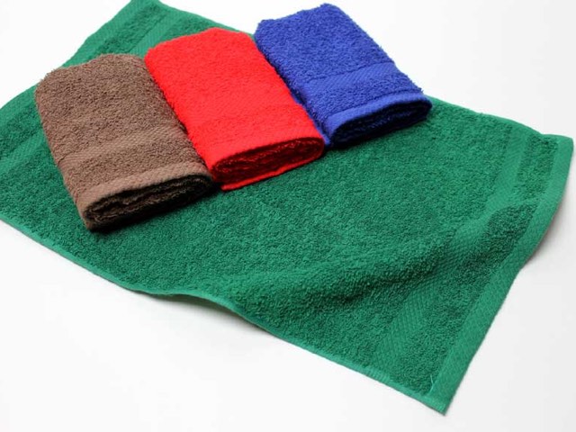 薄手で使い勝手のいい長方形のカラーおしぼり。介護施設などで、入居者様の顔や身体拭き用にもご利用いただいています。両端にボーダーの織り柄入りです。